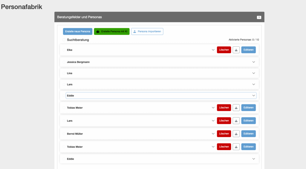 Dozierende und Lehrende können im Backend von eb.KIT Kurse anlegen, Pflicht- und Übungsaufgaben festlegen, Beratungsfelder definieren und in der sogenannten Persona-Fabrik unterschiedliche Persönlichkeitsmerkmale.